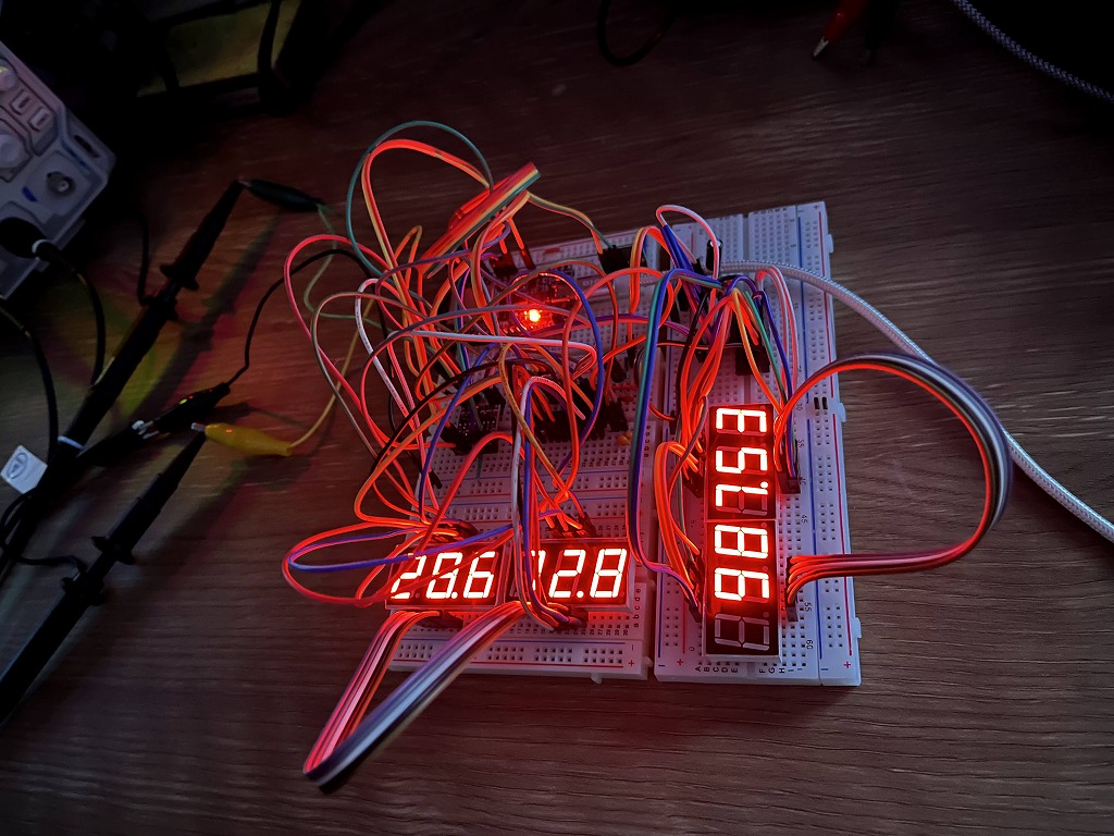 7セグLEDの表示が消えた後(一度消えると消えっぱなしになる)でも、ESP32内では温度データを取得できているし、TM1637への信号線をモニタしているとESP32からTM1637へデータを送っているのが観察できています。なので、TM1637への信号線に大きなノイズが入りデコード処理が止まっているのかなーと想像しています。